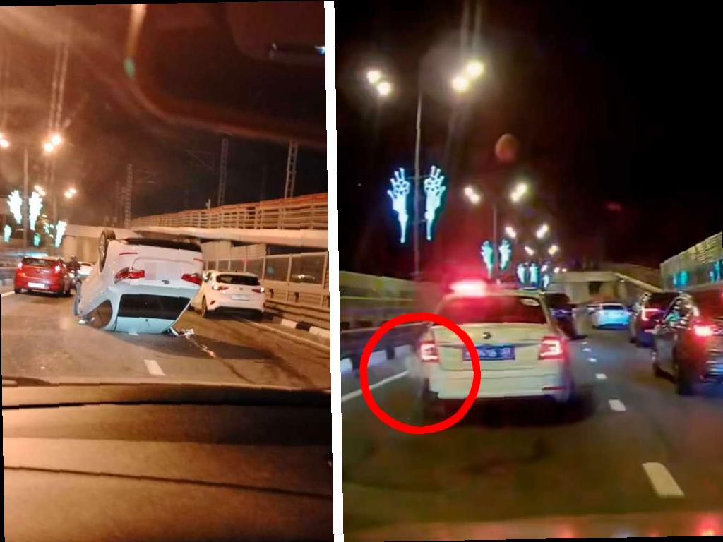 Недалеко от полуночи на мосту улицы Авиационной столкнулись две машины. В результате одно из них перевернулось и оказалось на крыше, как показали фотографии очевидцев.