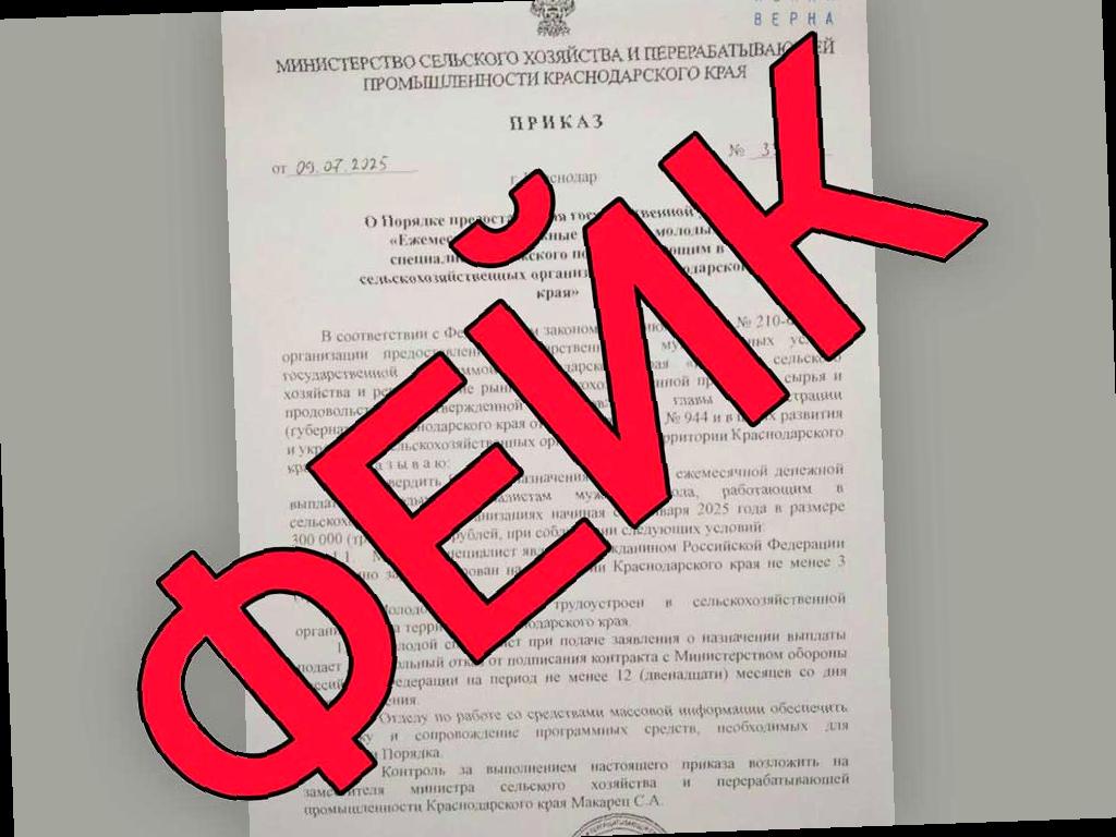 В последние дни предприятия Краснодарского края получили поддельное уведомление от Министерства сельского хозяйства и перерабатывающей промышленности. В сообщении говорится о выплатах специалистам за отказ от контракта с Министерством обороны РФ на год.