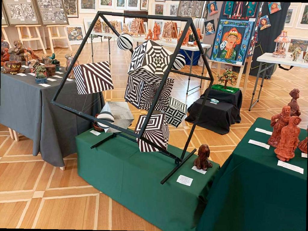 На выставке представлены работы в различных жанрах изобразительного искусства, включая академическое рисование, графику, живопись, а также декоративно-прикладное искусство, такие как вышивка, керамика, скульптура и другие виды рукоделия. Также можно увидеть работы в различных техниках, включая печатную графику.