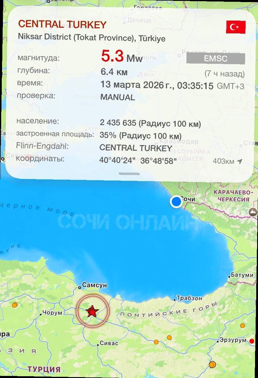 Ночью жители курортного города Сочи сообщили об ощущаемых подземных толчках — некоторые горожане даже проснулись от колебаний. По данным Европейско-средиземноморского сейсмологического центра, землетрясение произошло в 03:35, однако его эпицентр располагался в Турции — между городами Самсун и Сивас. Магнитуда землетрясения составила 5,3, а очаг залегал на глубине около 10 километров. Расстояние от эпицентра до Сочи — примерно 350 километров, поэтому в курортном городе были зафиксированы лишь слабые колебания силой около 2 баллов. Фото: Европейско-средиземноморский сейсмологический центр