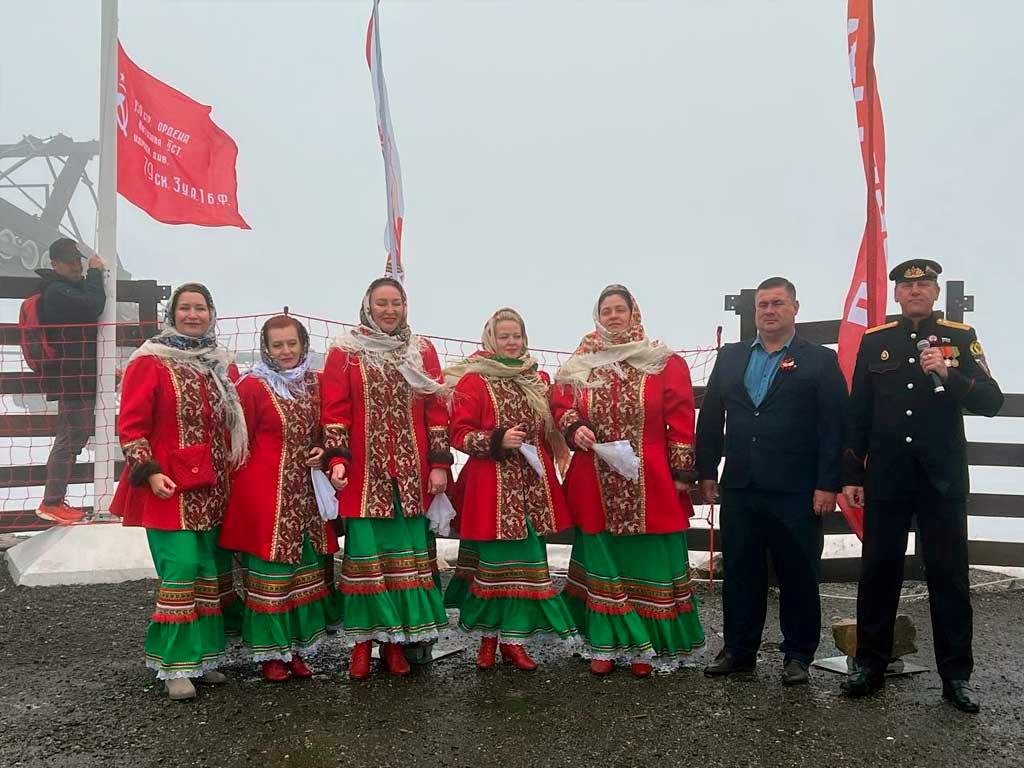 В горном кластере Сочи на Курорте Красная Поляна установили копию Знамени Победы на высоте 2200 метров над уровнем моря. На церемонии звучали песни военных лет исполнении ансамбля «Родные просторы» и солиста, ветерана боевых действий, Владимира Сергеева.
